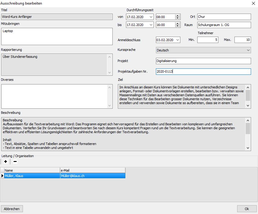 Auf einfachste Weise können verschiedene interne und externe Kurse, Schulungen und Workshops mit den dazugehörenden Beschreibungen erfasst werden. Sobald die Kurse terminiert und freigeschaltet sind, besteht für die Mitarbeiter und interessierte Personen die Möglichkeit sich anzumelden.